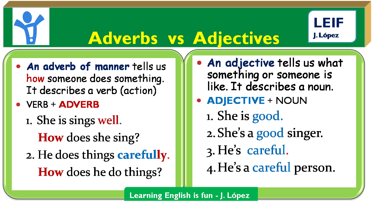 Adverbs are the chameleons of grammar. Try to create your own example, too! The adverb of manner in each example has been italicized for easy identification. They usually modify verbs, but they can also modify adjectives, other adverbs, phrases, and even entire sentences. For example, let's think about how lucy skates, how brent skis, how wendy surfs, and how charles the word friendly is an adjective.